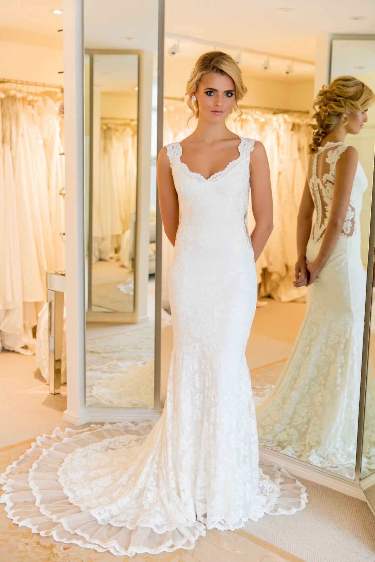 Available in both white and in ivory. It features a stunning train, and the hem is trimmed with an embroidered scallop detailing.